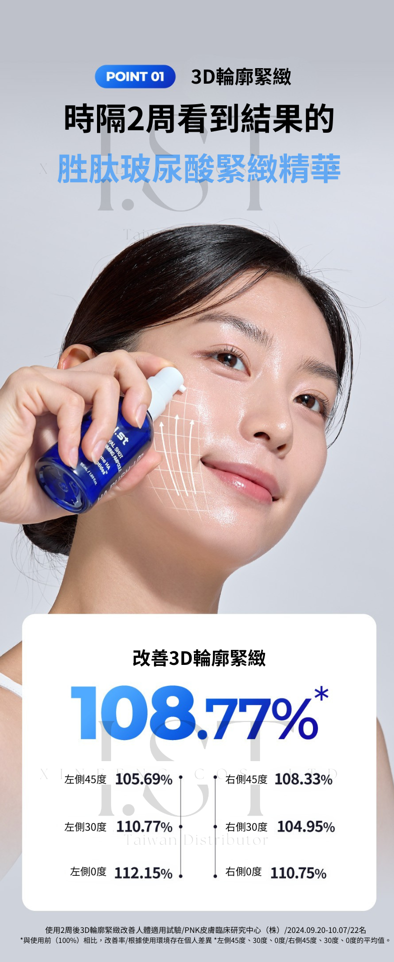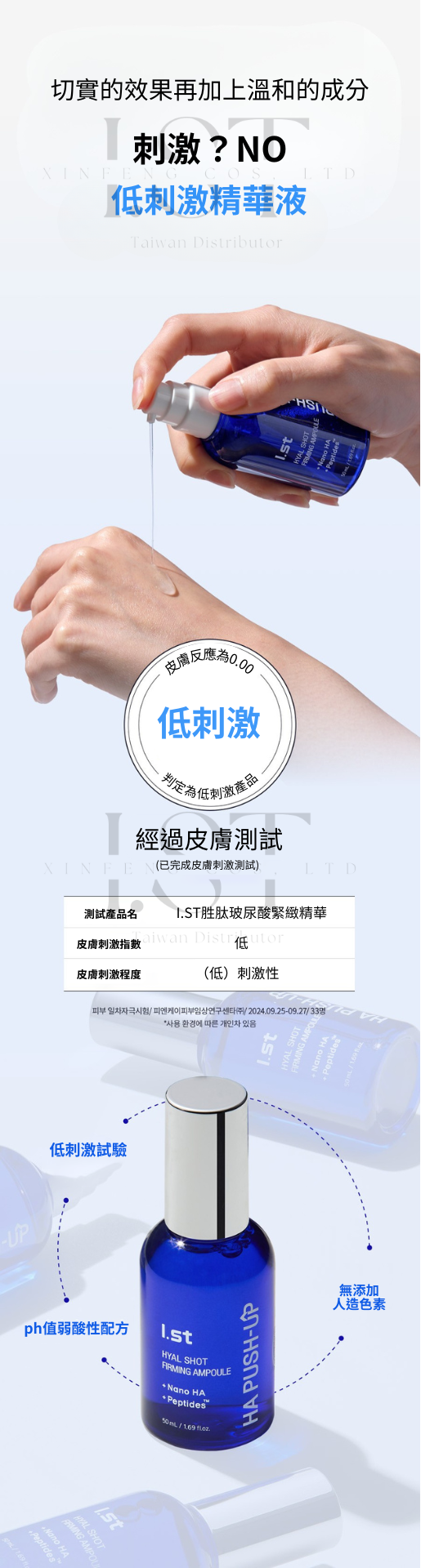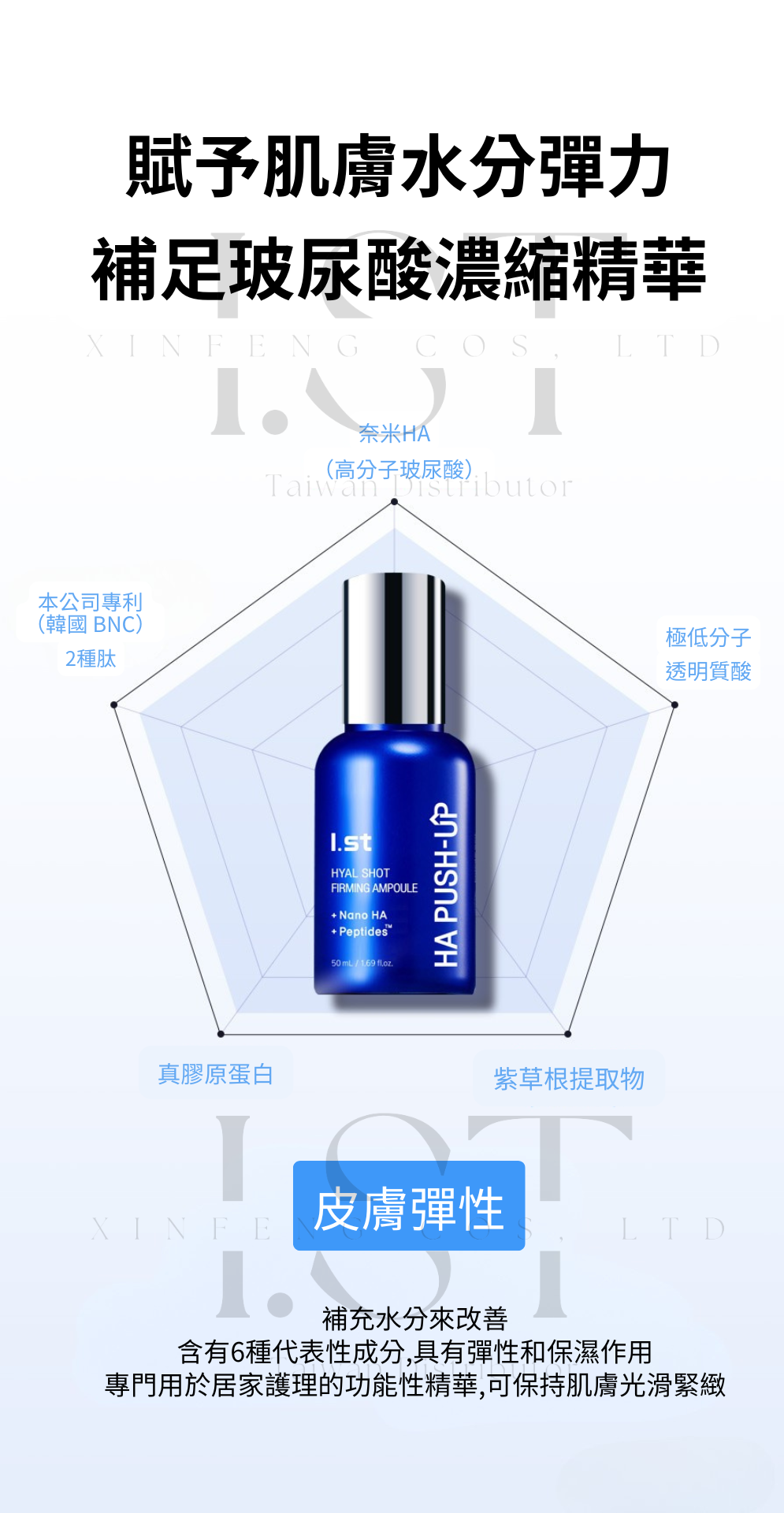I.st 專業團隊推出 HA PUSH-UP 胜肽玻尿酸緊緻精華,結合多重玻尿酸與專利胜肽成分,為肌膚補充所需水分與營養,維持平衡狀態,帶來柔嫩與緊緻感受。