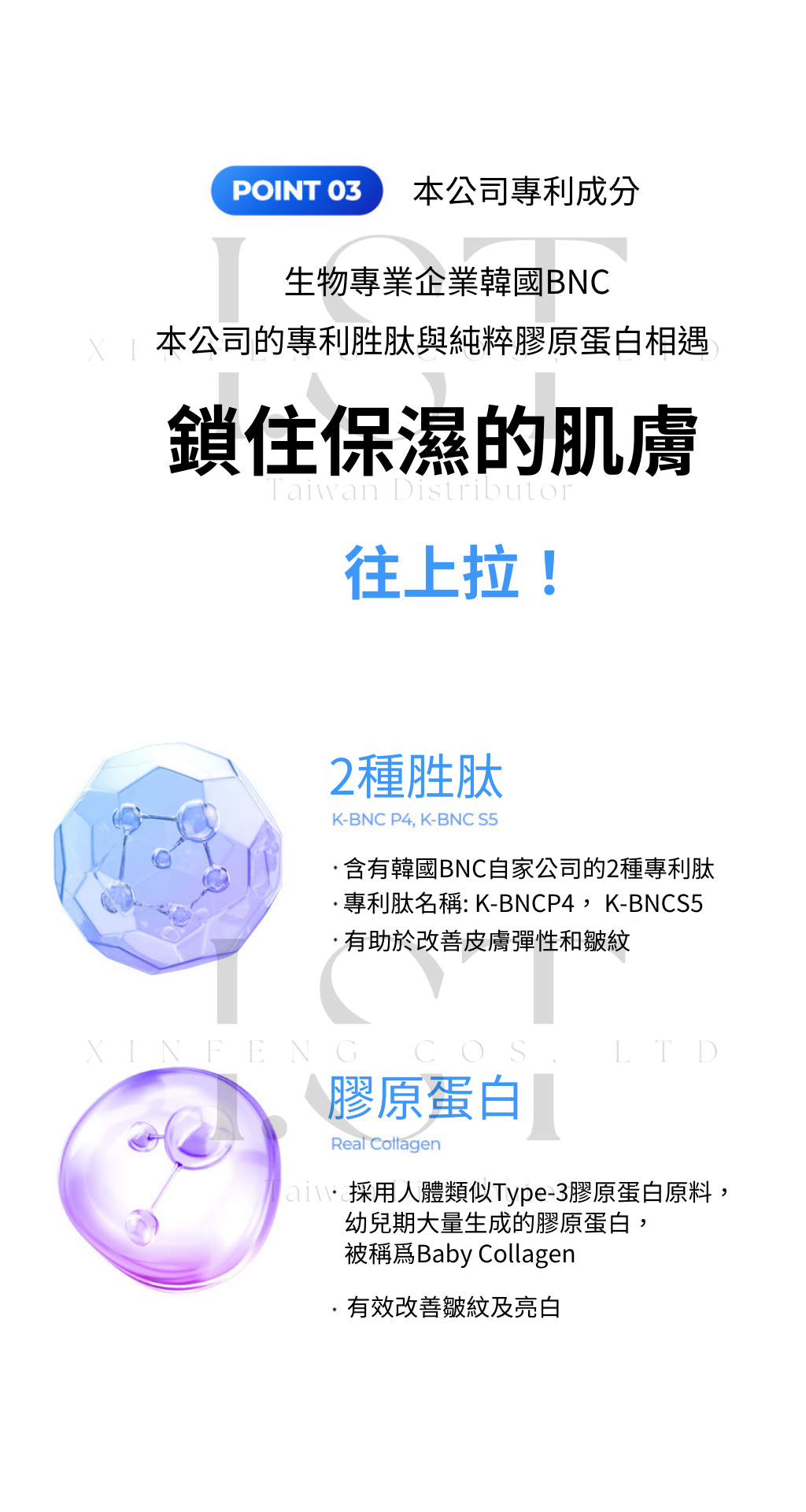 • 韓國 BNC 研發的專利胜肽(K-BNCP4、K-BNCS5),協同膠原蛋白作用,幫助維持肌膚的緊緻與彈性。